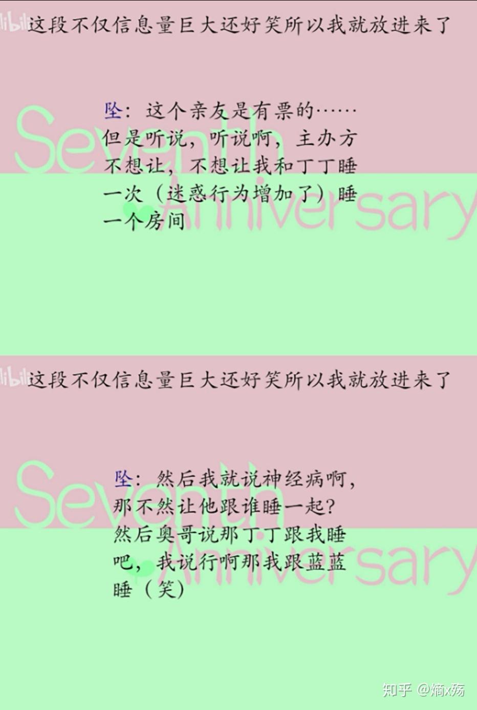 然后是之前坠子直播里的搞笑片段,信息量很大。大概意思就是说坠丁凯蓝等去参加一个活动,主办方不想让坠丁住一间房(这主办方怎么肥四)然后奥哥就说那我和丁丁住一间呗,坠子气笑了,就说好啊那我和蓝蓝一间……(就很搞笑也很秀)