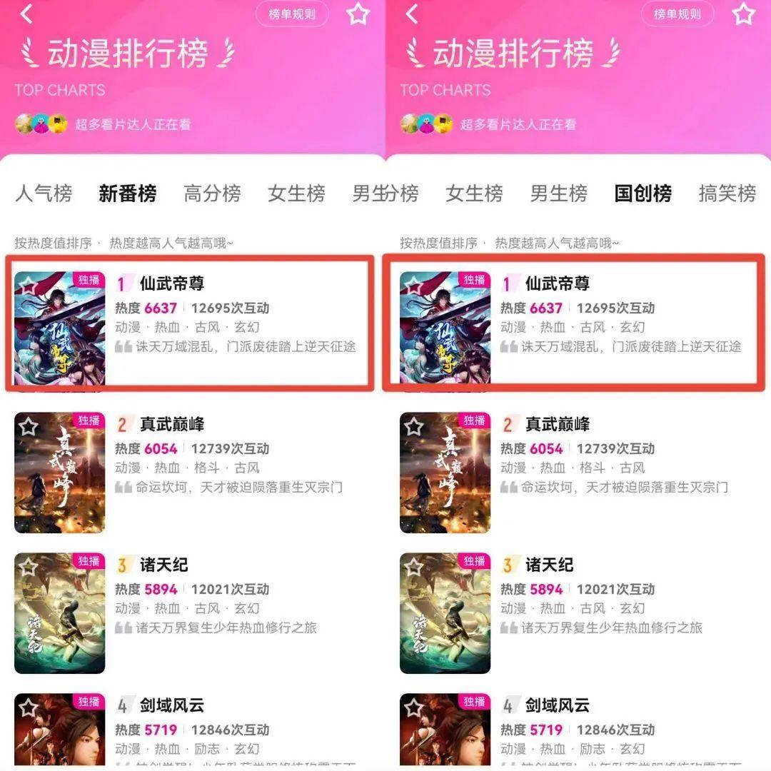 2021年9月,《仙武帝尊》漫动画独家登陆优酷,上线后不久,该作热度迅速飙升至7507,跻身优酷动漫分区第一梯队,并稳定霸榜动漫榜单,人气与热度力压其他同类作品。目前,《仙武帝尊》漫动画已经连更至162集,每周更新日,都有一大批忠实观众准时守候在屏幕前,期待与叶辰一起进入更广阔的世界里冒险打怪、修仙升级。