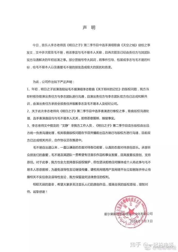 首先是7月3日的官方声明,那么长的大段文字其实几句话就能讲清楚:1,年初毛不易在巡演中翻唱的问题早就解决了,责任不在我们;2 你李志这个时候维权是想蹭《明日之子》热度,我们“拒绝恶意捆绑、嫁接事实”;3《明日之子2》再次侵权也和我们无关,而且“双方已经达成共识”。