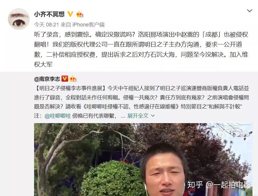 迟斌作为非法律和新闻专业的“外行”,在保持礼貌得体、提前通知对方要录音的同时,既阐明了自己的诉求,又弄清了事件中多方的权责纠葛,甚至在沟通中问出了更可怕的事实: 《明日之子》巡演除了侵权李志,还侵权了其他的音乐人。这随后得到了赵雷经纪人齐静的证实,洛阳巡演中赵雷的《成都》也被侵权翻唱。