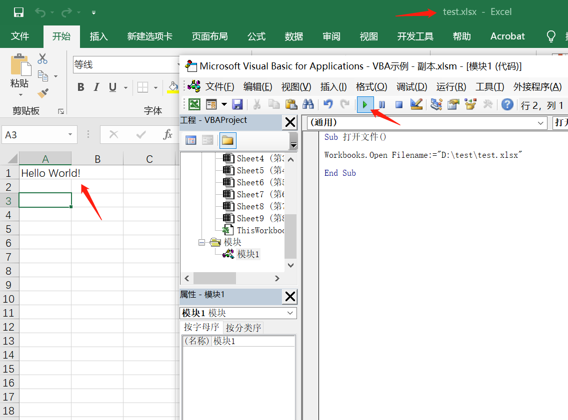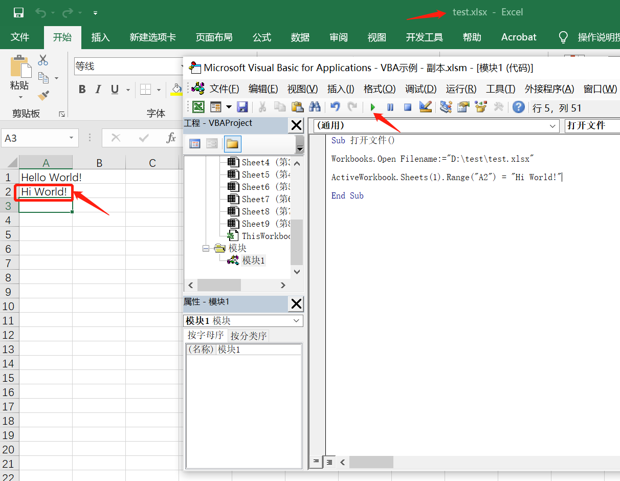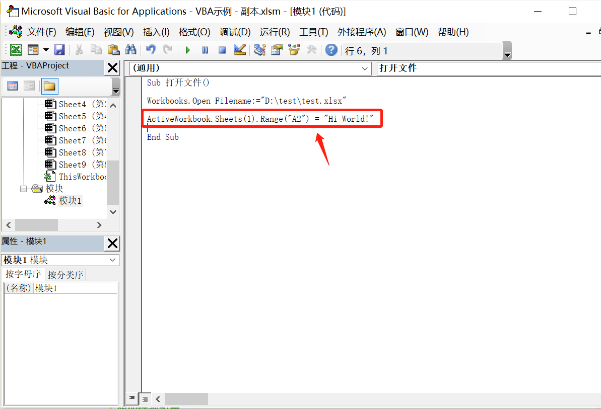 代码ActiveWorkbook.Sheets(1).Range("A2") = "Hi World!"表示:在当前活跃的文件下的第一张工作表下的A2单元格输入信息。
