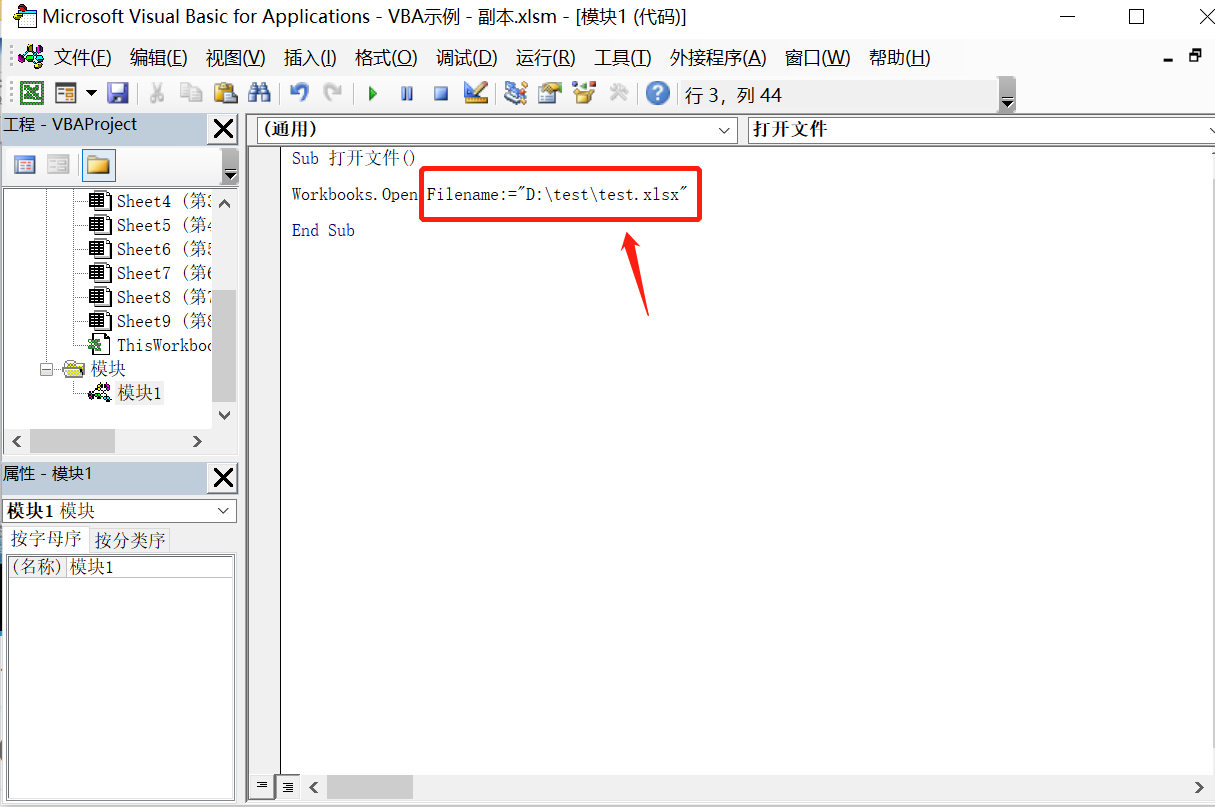 Filename:="D:\test\test.xlsx":找到D盘test文件夹下的文件。
