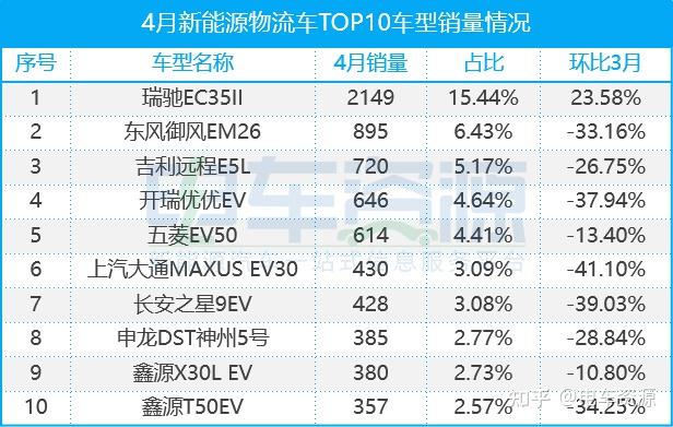 4月,销量排名前10的车型分别是瑞驰EC35II(2149,15.44%)、东风御风EM26(895,6.43%)、吉利远程E5L(720,5.17%)、开瑞优优EV(646,4.64%)、五菱EV50(614,4.41%)、上汽大通MAXUS EV30(430,3.09%)、长安之星9EV(428,3.08%)、申龙DST神州5号(385,2.77%)、鑫源X30L EV(380,2.73%)、鑫源T50EV(357,2.57%)。