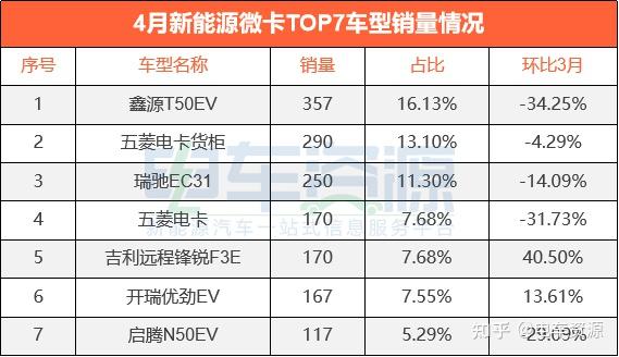 4月的新能源微卡销量环比3月有所下降,但整体浮动不大。 从车型来看在,共有7款车型销量破百,其中吉利远程锋锐F3E和开瑞优劲EV环比实现增长。