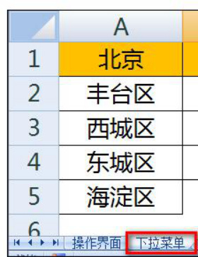 1、首先看一下原始数据,原始信息在一张工作表,第一行是省市名称,下面的若干行为对应省市下面的地名和区名。需要在另外一张工作表中A列和B列建立联动的二级下拉菜单。
