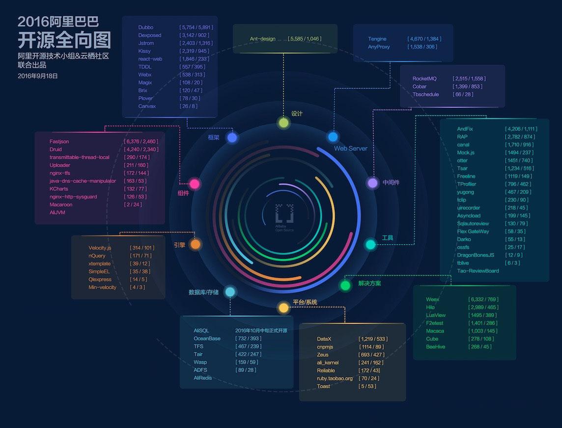 2016 阿里巴巴 73 款开源产品全向图详细介绍如下:
