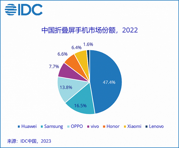 另外,折叠屏手机作为小众但形态新颖的产品,在国内智能机市场中占比从2021年的0.5%上升到1.2%。从2022年中国的折叠屏手机市场份额来看,华为仍是牢牢占据国内折叠屏市场第一的位置,市场份额为47.4%,遥遥领先于其他厂商,折叠屏的发展空间巨大。
