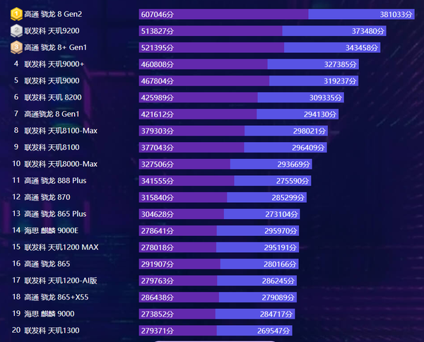 是目前排名靠前的处理器,性能是目前手机的高端水平。除了华为、苹果、三星等有自研的处理器之外,大部分品牌都用的是高通骁龙的处理器,还有一些中端机型用的是联发科的天玑系列处理器。