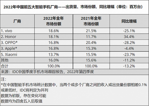 从国际数据公司IDC的2022年中国手机市场销量图可以看到,随着华为手机5G芯片受阻的持续,2022年华为手机的份额已经逐渐没落,其他国产品牌蜂拥而上。这两年OPPO、vivo和小米的手机产品线逐渐完善,市场占有率大大提高,外国品牌Apple依然强盛,手机品牌很难出现一家垄断的局面。