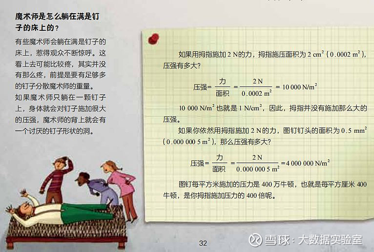 用“魔术师是怎么躺在满是钉子的床上的”这个有趣的设问,说明接触面积对压强的影响: