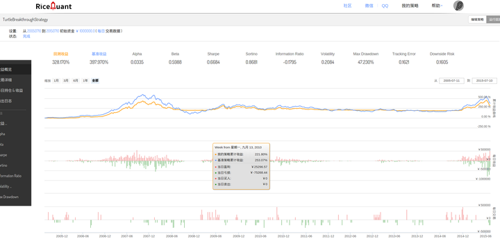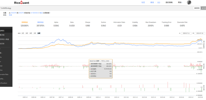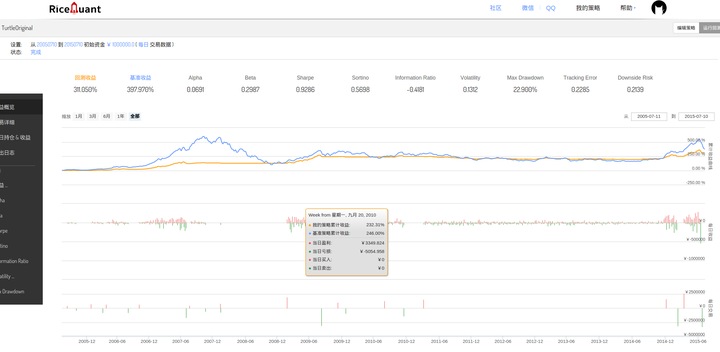 最后看图三与图四的对比,图四是海龟交易策略原版的表现,与图三比,夏普略有降低,但值得注意的是,最大回撤继续压缩至22,我想这主要是由于基于“N”的止损大法发挥的作用。