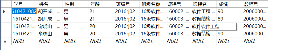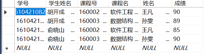 go create view 班级表1 --创建学生班级视图,要求查询所有学生的学号、班级号、班级名称、所属学院、班级人数及班主任 as select 学生表.学号,班级表.班级号,班级表.班级名称,班级表.所属学院,班级表.班级人数,班级表.班主任 from 学生表,班级表 where 学生表.班级号=班级表.班级号; go create view 成绩表1 --创建学生成绩视图,要求查询所有学生的学号、姓名、课程号、课程名、教师姓名及成绩 as select 成绩表.学号,学生表.姓名,成绩表.课程号,课程表.课程名,教师表.姓名,成绩表.成绩 from 成绩表,学生表,课程表,教师表 where 成绩表.学号=学生表.学号 and 成绩表.课程号=课程表.课程号 and 课程表.教师号=教师表.教师号; go create view 课程表1 --创建学生课程表视图,要求查询所有学生课程号、课程名、教师号及教师姓名 as select 成绩表.课程号,课程表.课程名,课程表.教师号,教师表.姓名 from 成绩表,课程表,教师表 where 成绩表.课程号=课程表.课程号 and 课程表.教师号=教师表.教师号; go create view 课程表2 --创建学生课程表视图,要求查询所有学生学号、课程号、课程名、教师号及教师姓名 as select 成绩表.学号,成绩表.课程号,课程表.课程名,课程表.教师号,教师表.姓名 from 成绩表,课程表,教师表 where 成绩表.课程号=课程表.课程号 and 课程表.教师号=教师表.教师号; go create view 学生信息表 --创建学生信息视图,要求查询所有学生学号、姓名、性别、年龄、班级号、班级名称、课程号、课程名、成绩及教师号 as select 学生表.学号,学生表.姓名,学生表.性别,学生表.年龄,学生表.班级号,班级表.班级名称,成绩表.课程号,课程表.课程名,成绩表.成绩,课程表.教师号 from 学生表,班级表,成绩表,课程表 where 学生表.班级号=班级表.班级号 and 学生表.学号=成绩表.学号 and 课程表.课程号=成绩表.课程号;