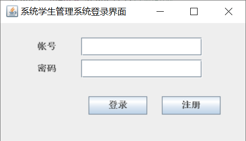 JOptionPane.showMessageDialog(null, "请输入帐号或密码", "错误", ERROR_MESSAGE);//显示信息对话框 } rs.close(); stmt.close(); c.close(); } catch ( Exception e1 ) { System.err.println( e1.getClass().getName() + ": " + e1.getMessage() ); System.exit(0); } } }); } public static void main(String[] args) {//在主函数中实现 login(); } }