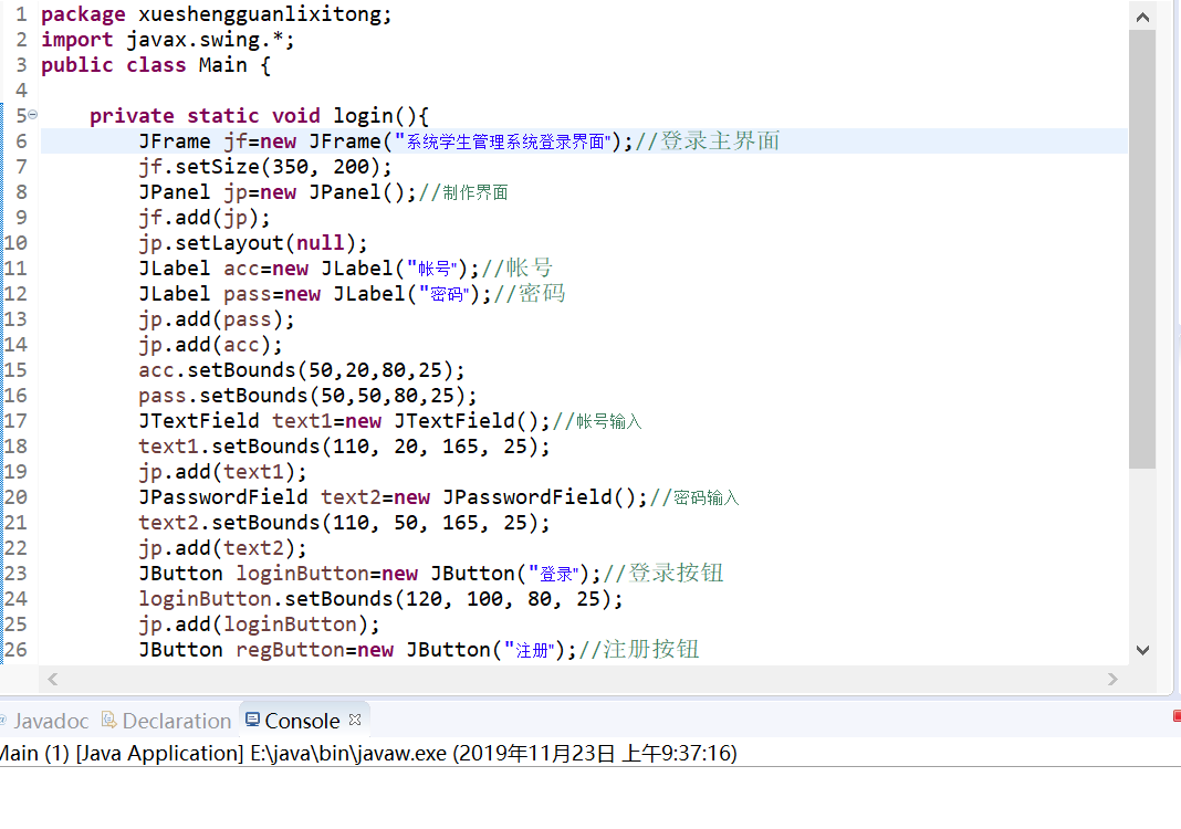jf.add(jp); jp.setLayout(null); JLabel acc=new JLabel("帐号");//帐号,JLabel标签 JLabel pass=new JLabel("密码");//密码,标签Label