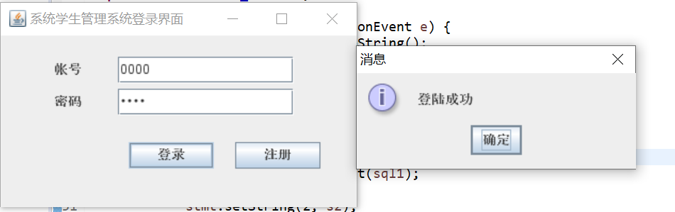 ResultSet rs = stmt.executeQuery();////查询返回的结果集 if(s1.length()!=0&&s2.length()!=0) { if(rs.next()) { JOptionPane.showMessageDialog(null, "登陆成功");//显示信息对话框 }