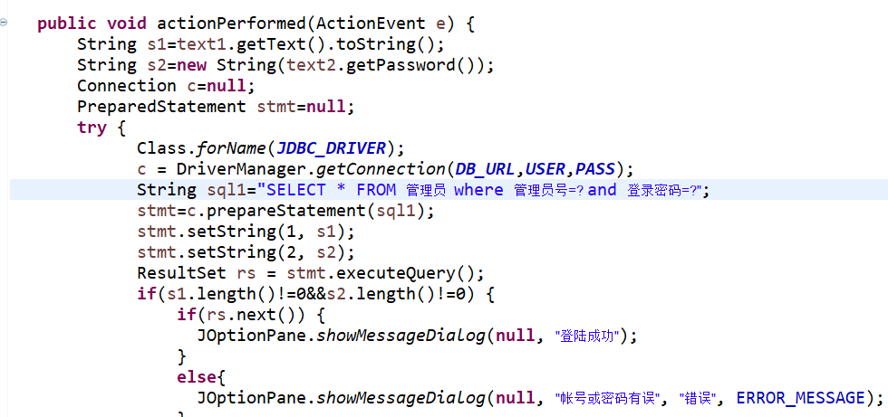 Class.forName(JDBC_DRIVER); c = DriverManager.getConnection(DB_URL,USER,PASS);////连接数据库 String sql1="SELECT * FROM 管理员 where 管理员号=? and 登录密码=?";//连接数据库,可以实现查询的功能,只需要把帐号和密码的信息放进数据库里面的表,然后在代码中实现一个在表中查询的功能,即可实现判断正确