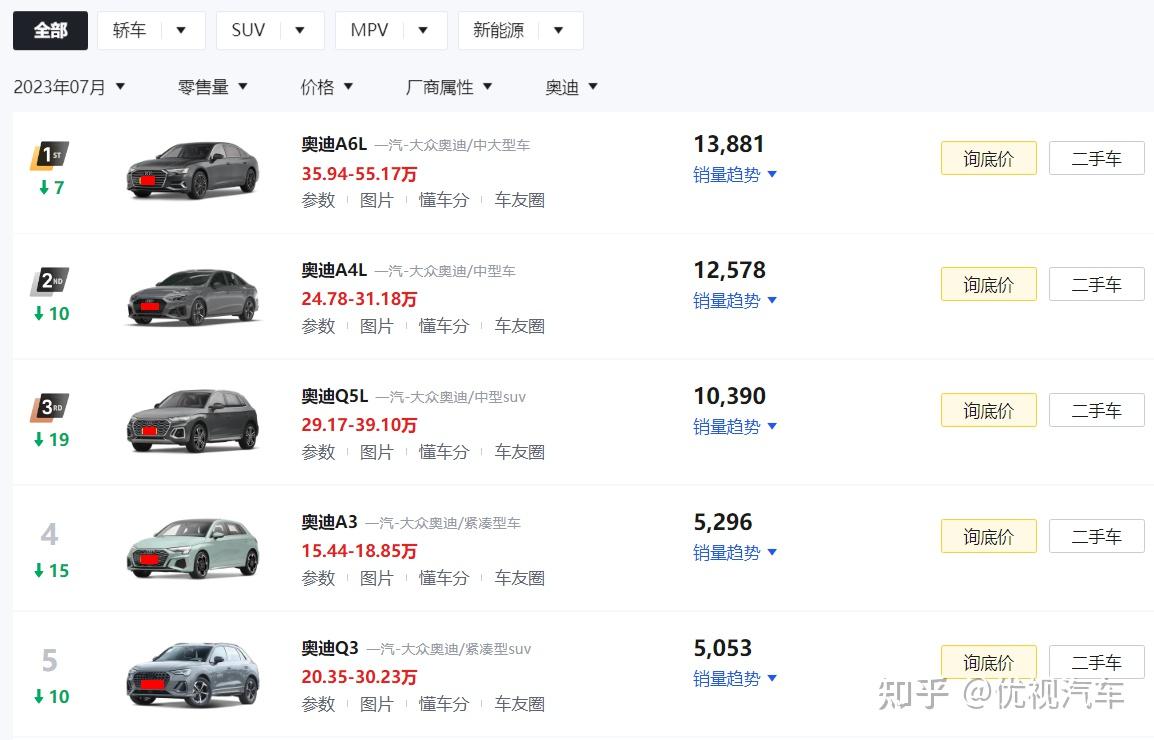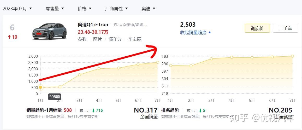 就以奥迪品牌来说,虽然7月销量最好的车型分别是奥迪A6L(13881辆)、奥迪A4L(12578辆)、奥迪Q5L(10390辆)、奥迪A3(5296辆)、奥迪Q3(5053辆)等传统燃油车,但来到第六名之后我们会发现,奥迪Q4 e-tron不就是一款新能源车吗?要知道,这款车在7月份可是卖出去了2503辆,排名也上升了10个名次,所以谁说豪华品牌的新能源车卖不动?这不销量也挺好吗?