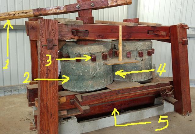 当左边的石辘转动后,通过图3中具有齿轮作用的木块,带动右边的石辘转动,两个石辘之间有合适的缝隙,甘蔗从图4中的位置喂进转动的石辘,两个石辘转动后产生的压力,压榨出甘蔗汁,甘蔗汁流入图5标示的容器中。这样就完成了甘蔗榨汁。