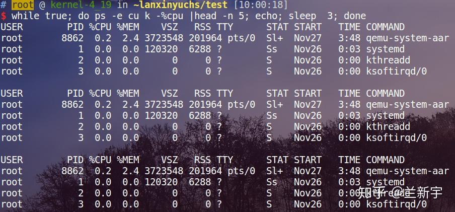 看来ps命令和top命令的输出也很多重叠的部分(毕竟它们都是从"/proc/$(pidof process)/stat"里提取的信息),也许两者最大的区别就是top命令可以一直动态刷新显示。好处当然是可以实时观察变化,但之前的数据会被新的数据覆盖掉。其实用ps指令配合很简单的shell脚本,像这样