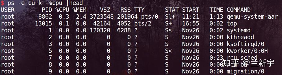 "k"后面跟上某个特性的名称,就可以按照这个特性排序,例如"k rss"即是按rss升序,"k -rss"则是按rss降序,其他常用的包括按CPU占用率排序的"%cpu",按执行时间排序的"time"等。因为有些进程在启动时的名称很长(比如qemu),可以再加上一个"c",让输出排列的比较整齐。