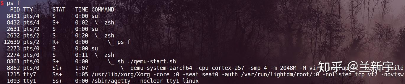 由于用户进程之间存在继承关系,可以通过加"f"参数来查看这种关系,输出结果以树形排列的形式呈现: