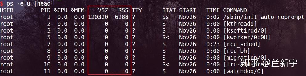 内核线程所占用的内存大小不通过VSZ和RSS表达,所以在ps命令的输出中,内核线程对应的VSZ和RSS的值都为0。