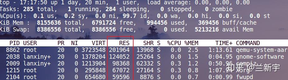 Linux中另一个常用的命令是top,它通常用于查看CPU的占用率,但同时也能显示VSS和RSS的信息,只不过在这里叫法不一样,分别被称为了"VIRT"和"RES"。top命令的输出默认是按CPU占用率排序的,但同样可以实现按照其他规则排序,比如在top命令的运行过程中,使用"shift+m"就是按RES/内存排序,使用"shift+t"就是按CPU执行时间排序,"shift+p"则可切回按照CPU占用率排序。