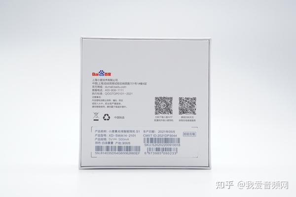 包装盒背面有“Baidu百度”品牌LOGO,公司名称:上海小度技术有限公司。标签上信息由产品名称:小度智能真无线耳机 S1,产品型号:XD-SWA14-2101,产品规格:5V-500mAh,生产日期:2021年05月,CMIIT ID:2021DP3044,以及出厂条形码等。
