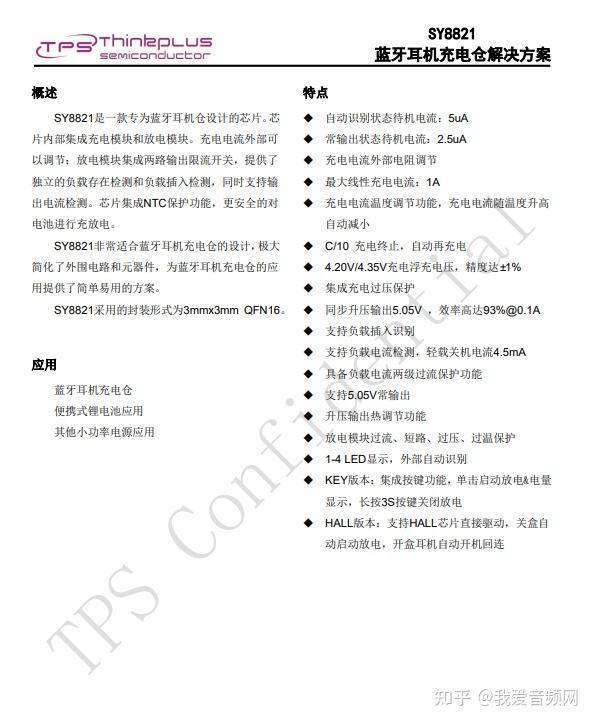 TPS思远 SY8821蓝牙耳机充电仓解决方案,内部集成充电模块和放电模块。充电电流外部可以调节;放电模块集成两路输出限流开关,提供了独立的负载存在检测和负载插入检测,同时支持输出电流检测。芯片集成NTC保护功能,更安全的对电池进行充放电。