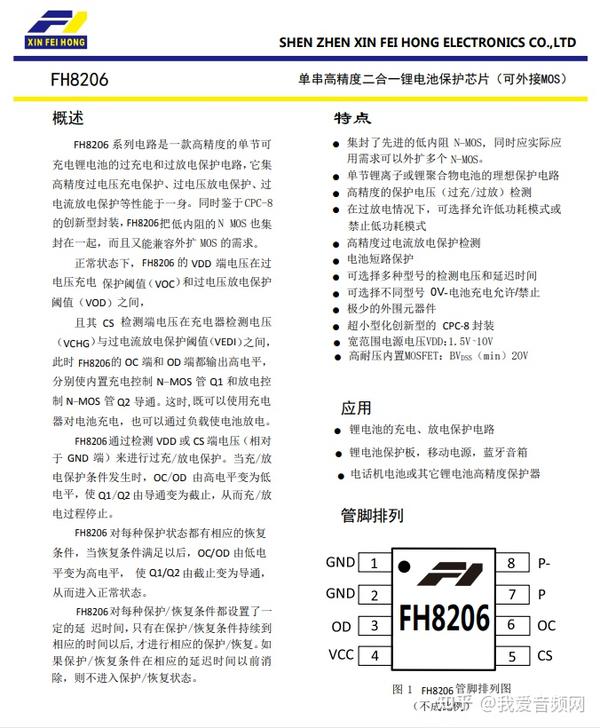 Xinfeihong鑫飞宏FH8206二合一锂电保护IC,是一款高精度的单节可充电锂电池的一体化保护芯片,支持高精度的过压保护、过放保护、过电流放电保护等功能,采用节省空间的CPC-8封装。