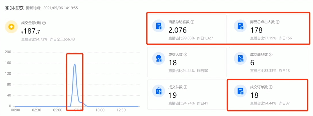 实时概览里可以直观了解当日整场直播成交金额、商品访客、商品点击、成交人数、成交订单数等重点数据指标。