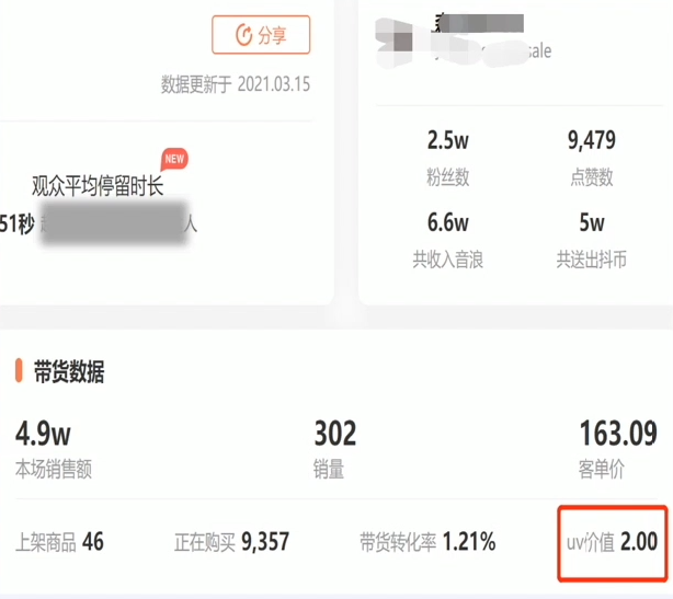 直播间收获的音浪总数,带货直播间不同于娱乐直播间,一般音浪收入普遍不高,不做参考。