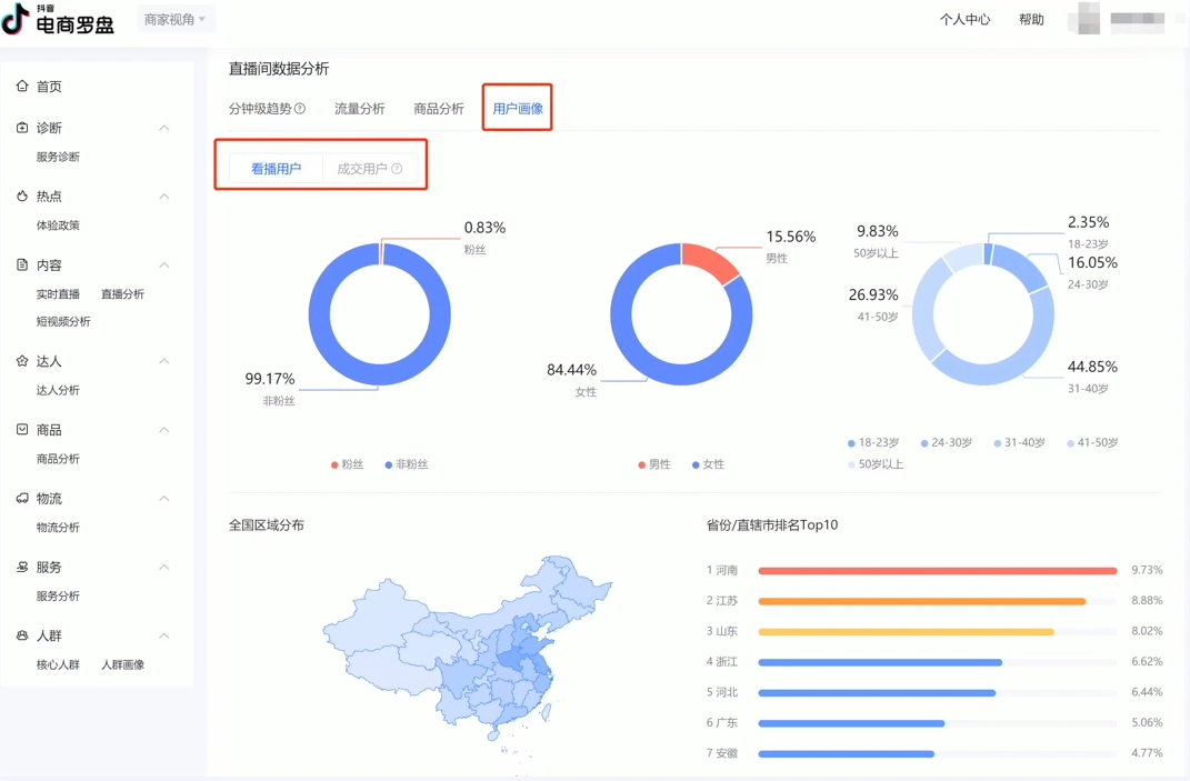 用户画像分为看播用户和成交用户,我们可以通过性别、年龄、区域、是否粉丝四个维度对两组用户画像进行对比分析,为下一场的直播投放找到目标人群。