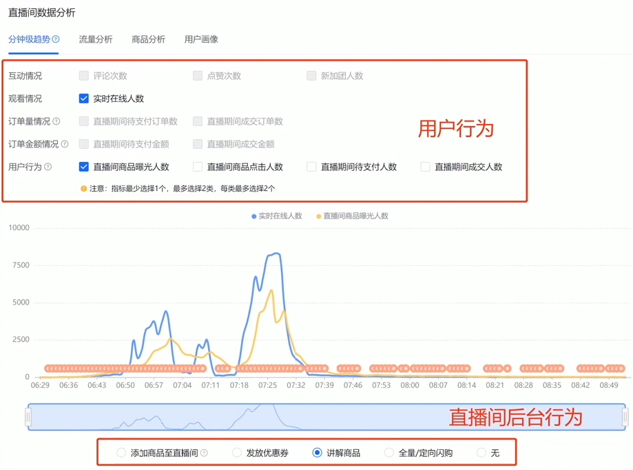 分钟级趋势包括用户行为数据和直播间后台行为数据,通过对比两组数据可以分析出直播间具体是因为什么动作促使用户在直播间产生购买行为。