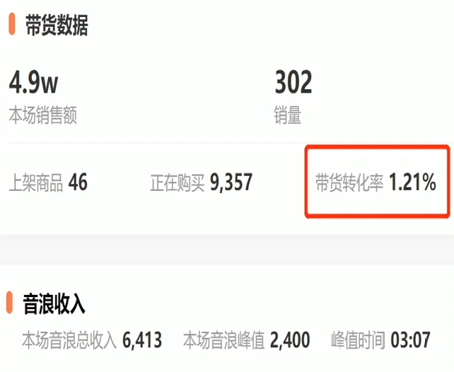 直播基础数据包括:收获音浪、观众总数、新增粉丝、付费人数、评论人数5个部分,其中收获音浪和付费人数对于带货直播间的参考意义不大,可以不必在意。