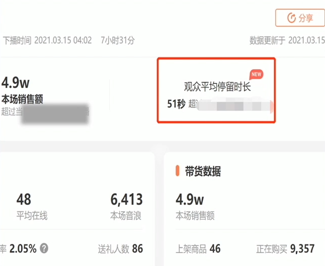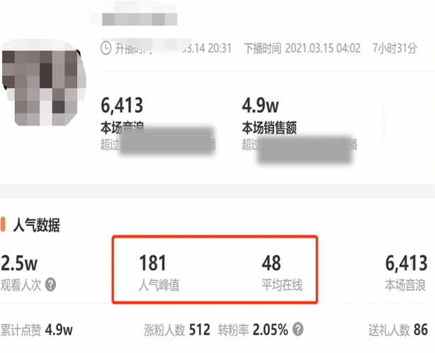 人气峰值和平均在线决定了直播间的人气,是我们直播间能否带动货的大前提。一般平均在线能稳定在50人左右直播就有基本的带货能力,能够赚到钱。