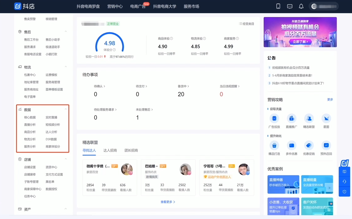 电脑端复盘一般是利用抖店后台进行复盘,一共包含10种数据:实时直播、直播分析、短视频分析、商品分析、达人粉丝、物流分析、DAR分析、服务分析、商家体验分。
