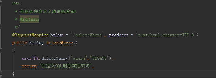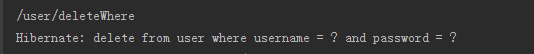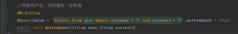 自定义SQL查询语句生效,接下来让@Query注解配合@Modifying注解一共使用,可以完成数据的删除、添加、更新操作。下面我们来测试下自定义SQL完成删除数据的操作,我根据名字、密码字段共同删除一个数据,接口代码如下图
