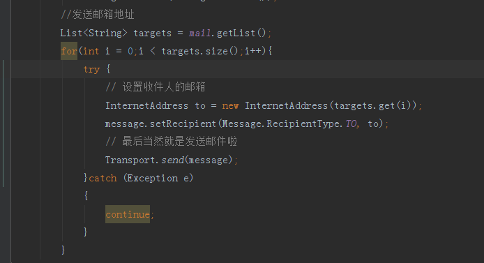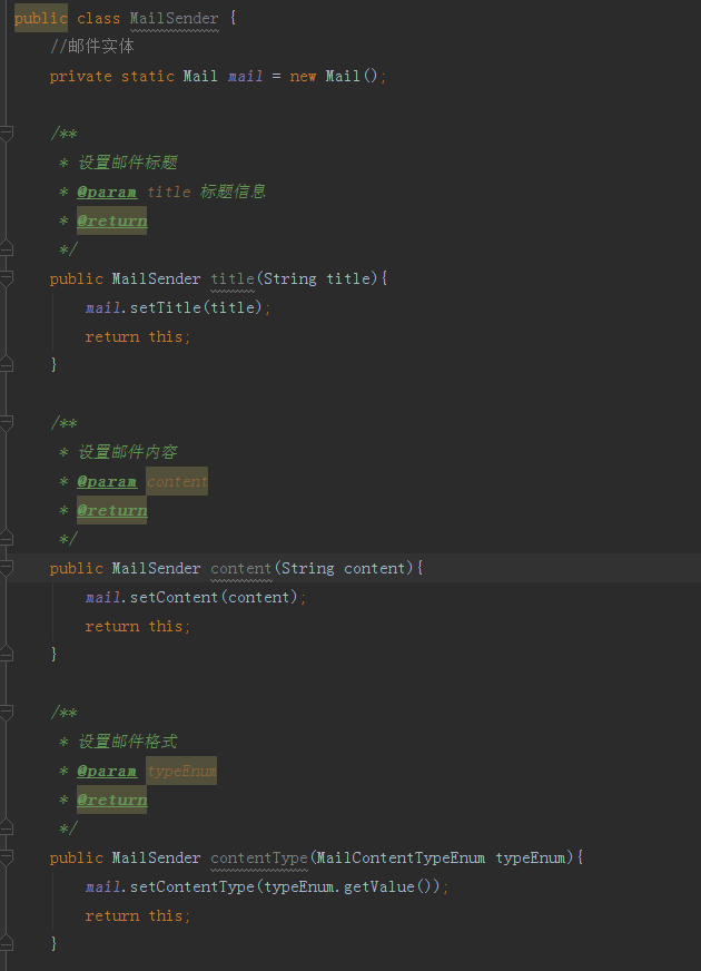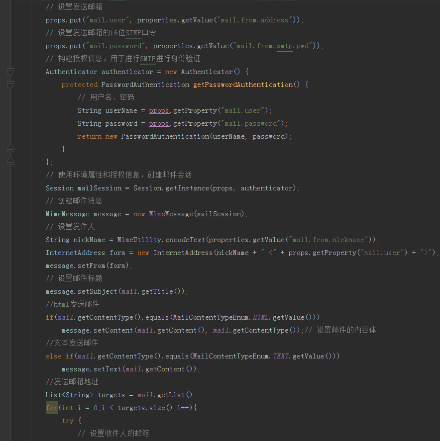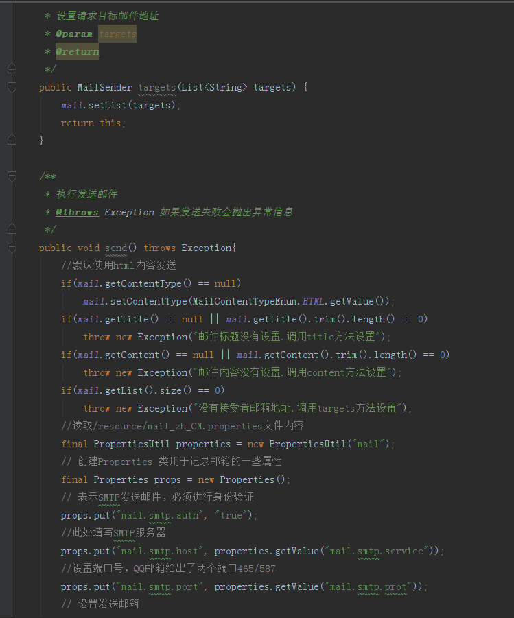 下面我们来创建一个 MailSender 也就是邮件发送者实体,主要作用就是用来配置发送邮件参数以及执行发送邮件,代码如下图所示: