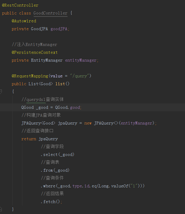 下面我们创建测试程序使用我们引入的querydsl完成查询功能,我们先来创建一个GoodController,作为访问入口,添加 GoodJPA 的 Spring 注入Bean,然后添加根据商品分类查询商品列表的方法。如下图