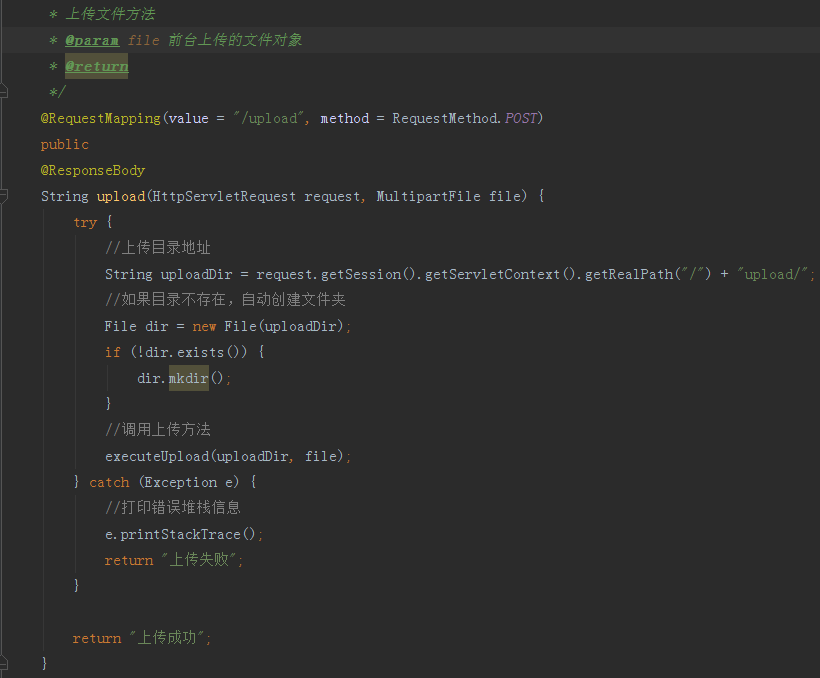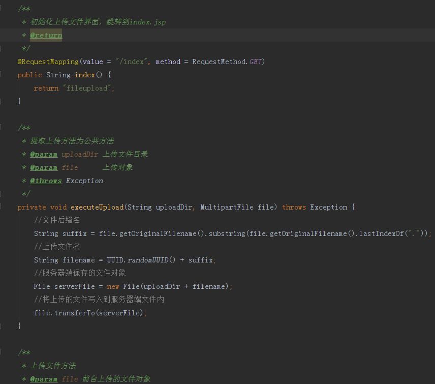 完成后我们需要让springboot内的SpringMVC转发到index.jsp页面,我们创建一个名叫做UploadController的控制器,添加初始化index.jsp页面方法以及上传文件的方法/upload,首先实现单文件上传,代码如下图