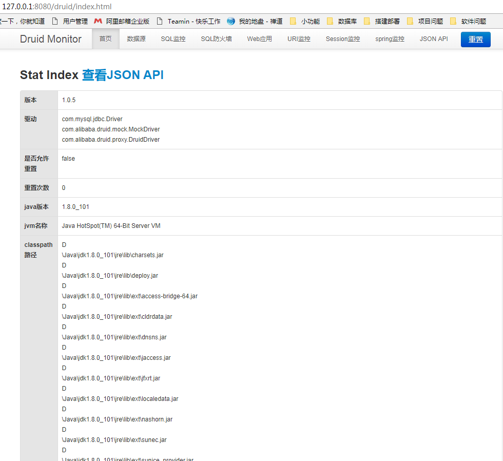 我们已经成功的访问到了监控首页,可以看到大致包含了如下几个模块:数据源、SQL监控、SQL防火墙、Web应用、URI监控、Session监控、JSONAPI等。