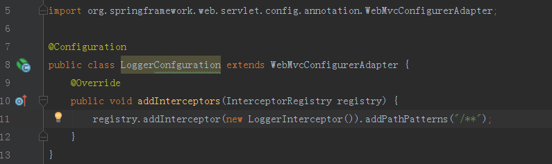 上述我们的代码基本已经编写完成,不要忘记最重要的一步,我们需要将LoggerInterceptor拦截器添加到我们的SpringBoot项目内,让SpringBoot项目可以识别拦截。我们需要创建一个LoggerConfguration配置类,如下图所示: