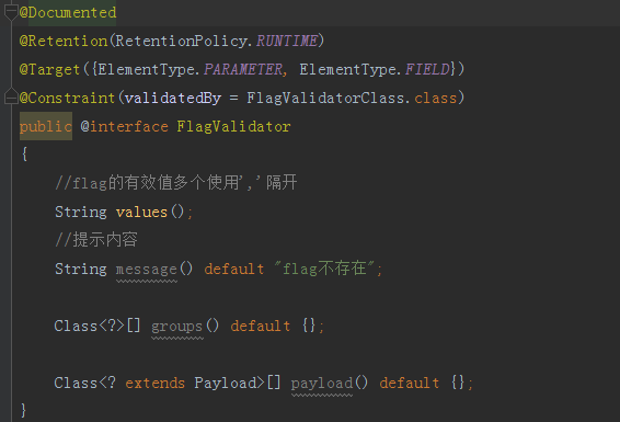 如果系统内需要一些自定义的验证,我们该如何处理?自定义验证需要我们提供两个文件内容,一个是注解、另外一个是对应注解继承 ConstraintValidator 的实现类,下面我们假如有这么个情景,我们在DemoEntity内添加一个字段flag,需要验证flag字段内容仅为1,2,3。先创建一个注解,注解内部需要对应验证注解的验证实现类,所以创建后会报错。 FlagValidator 自定义验证注解内容如下图
