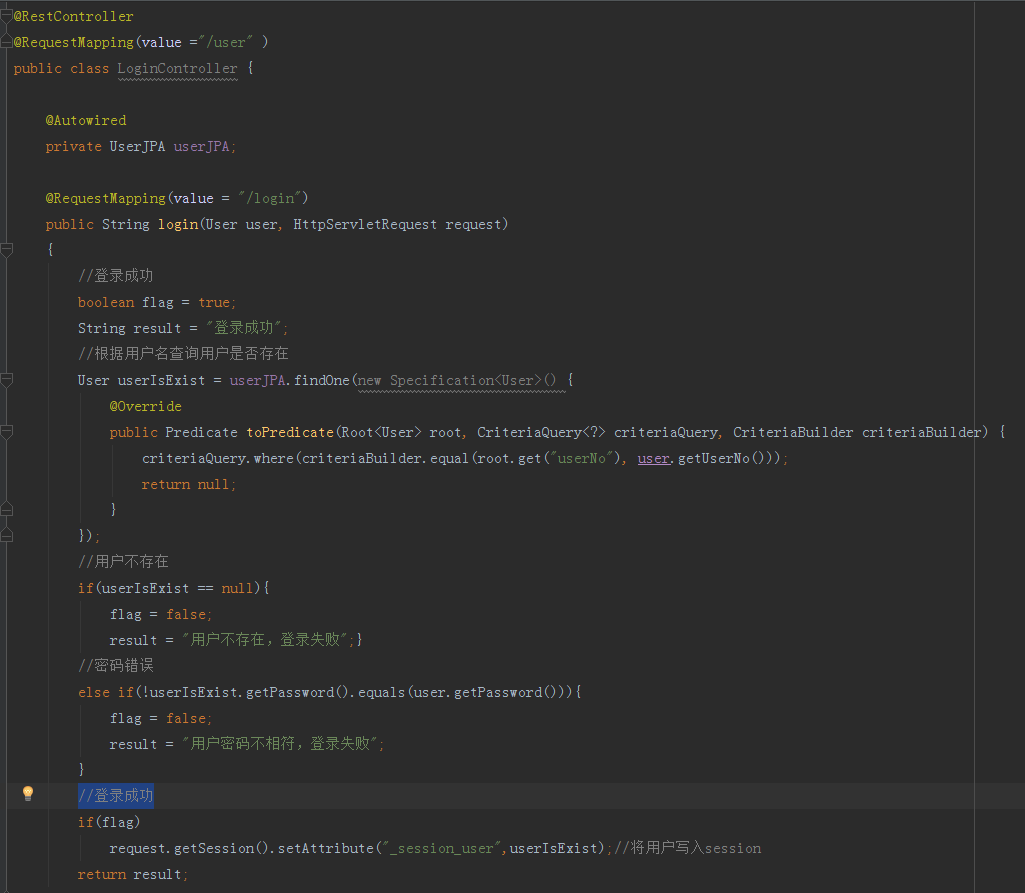 上述JSP文件已经创建完成,下面我们需要让SpringBoot内置SpringMVC控制器转发到对应的JSP页面,我们创建名叫LoginController的类文件,并且加入登录用户的方法,用户的实体以及JPA配置完成后我们再次打开LoginController,将UserJPA使用SpringBean的形式注入,然后完成简单的登录逻辑,再次修改LoginController在登录成功的地方,添加将用户写入 session 中,如下图所示: