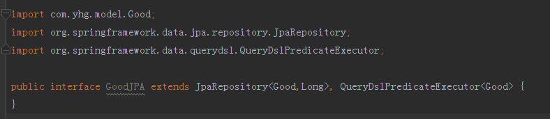 目录内有四个querydsl插件自动生成的实体,命名规则就是原实体名称前+Q前缀。可以查看类内的代码,都是由querydsl插件自动构建的,创建一个GoodJPA接口,让其继承QueryDslPredicateExecutor接口,该接口是SpringDataJPA提供的querydsl查询接口。GoodJPA代码如下图