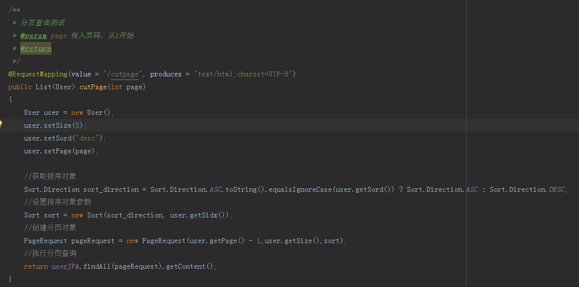 修改User继承BaseEntity,然后在数据库内添加上几条测试数据,我们每次页面的数量就不用20了,我们在创建查询条件时修改成5条。 我们打开UserController添加cutPage方法,用于作为分页查询入口,(注意:文章的讲解都没有添加Service层所以所有的业务逻辑都在Controller内处理的,正式项目请不要这样编写。)我们在cutPage方法内添加对应的分页逻辑;上面在BaseEntity内添加了排序的字段以及排序方式,编辑下cutPage方法,修改pageRequest创建方式,添加Sort对象到PageRequest对象内,就可以实现排序数据。如下图
