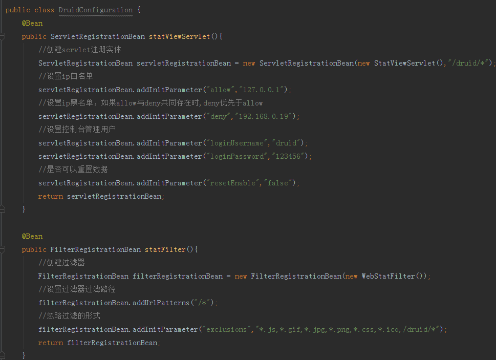 上述图内打印了sql语句,而这个sql则是SpringDataJpa自动生成的,我们已经完成了SpringBoot整合Druid连接池的部分,那么我们接下来开启Druid的监控功能(开启监控功能,可以在应用运行的过程中,通过监控提供的多维度数据来分析使用数据库的运行情况,从而可以调整程序设计,以便于优化数据库的访问性能)。下面我们来实现Druid的访问 Servlet 以及 Filter ,如下图所示: