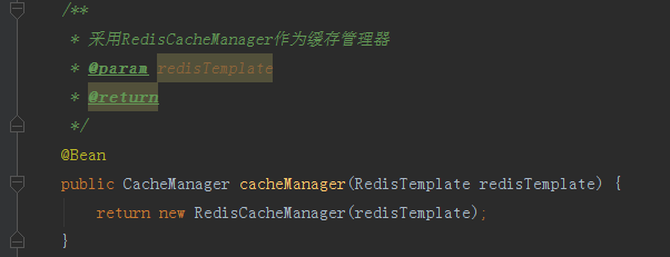 使用 @EnableCaching 注解来开启项目支持缓存,在配置类内添加了方法 cacheManager() ,方法的返回值则是使用了我们的 Redis 缓存的管理器, SpringBoot 项目启动时就会去找自定义配置的 CacheManager 对象并且自动应用到项目中。
