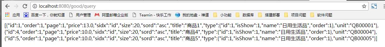 上图注入了EntityManager对象,因为我们构建JAPQuery对象需要它作为参数传入,使用QueryDSL查询的形式完全就是平时使用对象的形式那么简单!上面完全使用的QueryDSL进行的查询操作,向数据库表信息添加几条测试数据,然后访问测试下,下面接着说SpringDataJPA下怎么使用JPA。运行项目,访问地址: 127.0.0.1:8080/good/query 如下图